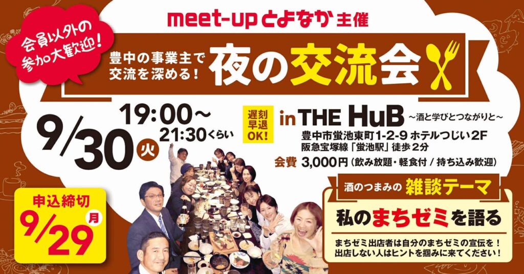 豊中市内事業者の任意団体「meet-upとよなか」主催の事業者交流会。今月のテーマは、10/20から始まるとよなかまちゼミで開催する「私のゼミを語る」。 豊中市内の事業者なら会員外でも参加可、ゆる~い会です。ご参加お待ちしております。 お申込みは下記... -
