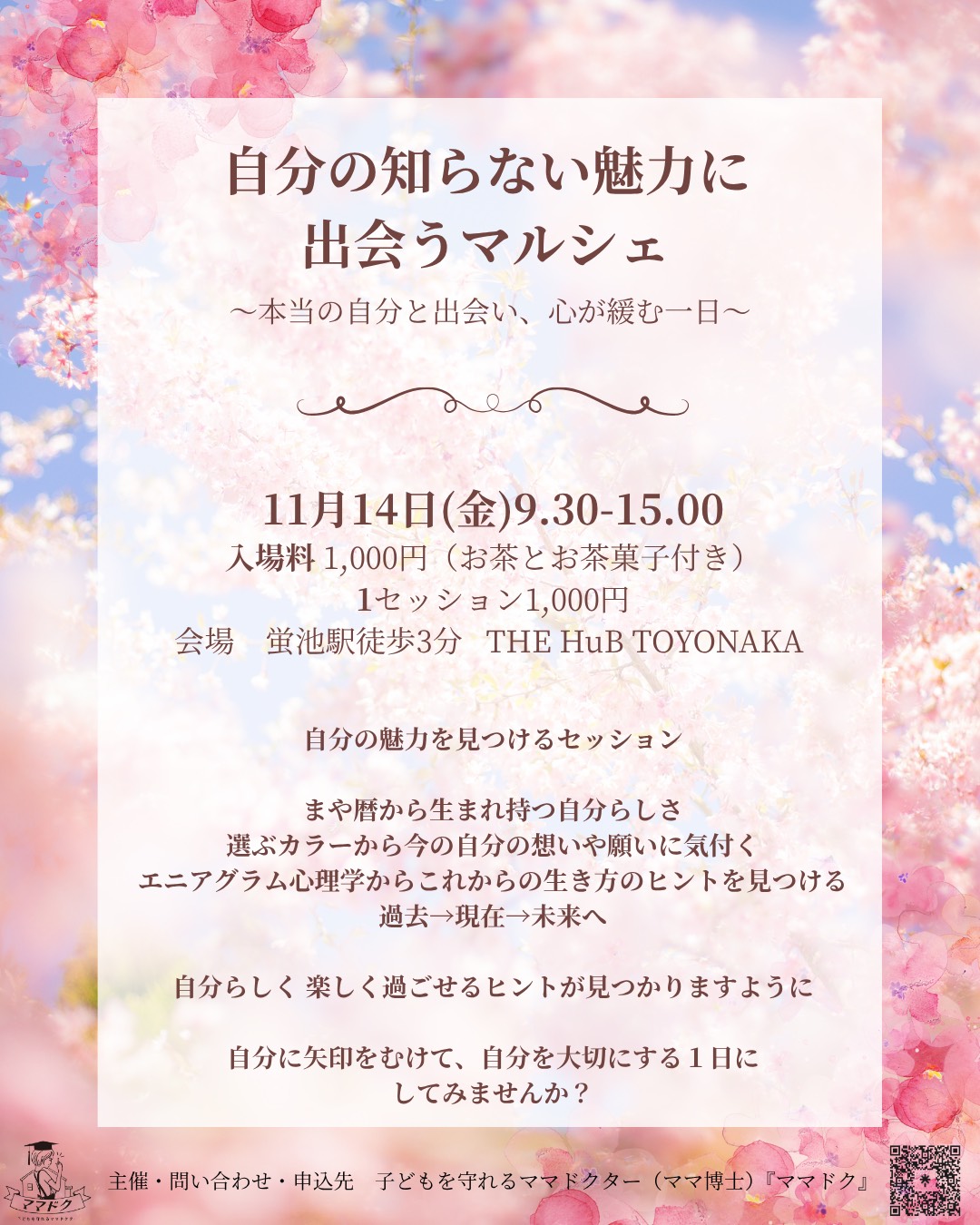 11月 14 @ 09:30 - 15:00 自分の知らない魅力に出会うマルシェ ~本当の自分と出会い、心が緩む一日~ 理想を求めすぎて疲れてしまう 自分にマルをつけられない 専門 […] ¥1,000