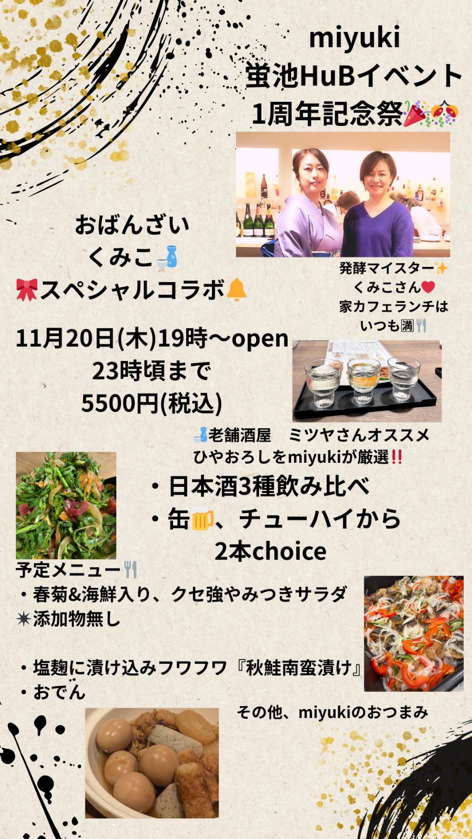 11月 20 @ 19:00 - 23:00 miyuki1周年記念🎉おばんざい久美子コラボ酒場 HuBにて、イベントを開催し始めて、1年! 呑兵衛miyukiが、1周年記念祭 老舗酒屋ミツヤさんで、呑兵衛m […] ¥5,500