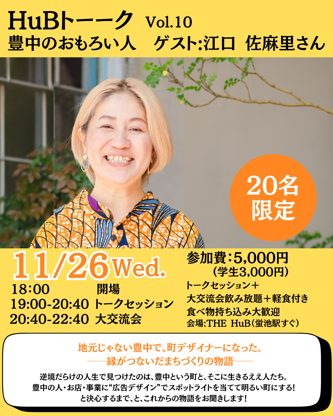 11月 26 @ 18:00 - 23:00 HuBトーーク 豊中のおもろい人Vol.10 ゲスト江口 佐麻里 こんにちは★ HuBオーナー まちと人のおもろい明日を創る人、伊吹です。 HuBのコンセプトは、 -酒と学びと […] ¥5,000
