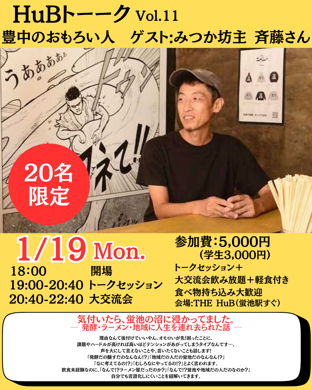 1月 19 @ 18:00 - 23:00 HuBトーーク 豊中のおもろい人Vol.11 ゲスト斉藤 光典さん こんにちは★ HuBオーナー まちと人のおもろい明日を創る人、伊吹です。 HuBのコンセプトは、 -酒と学びと […] ¥5,000