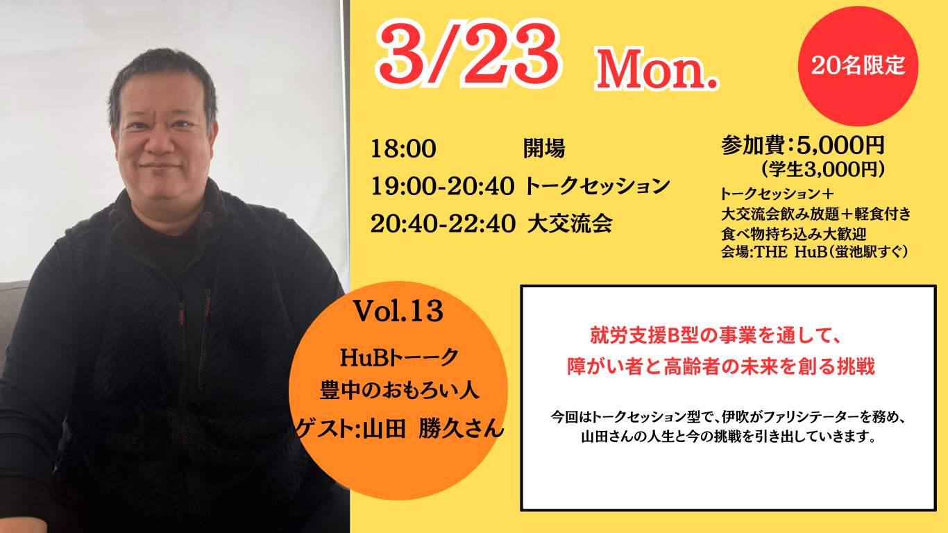 今回はトークセッション型で、伊吹がファリシテーターを務め、山田さんの人生と今の挑戦を引き出していきます。